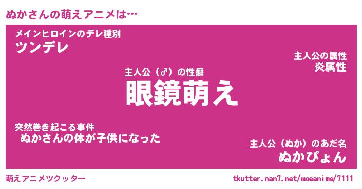 | 男性向けラノベタイトル風あだ名 | 『ぬかの憂鬱』『ノーゲーム・ノーヌカ』 |