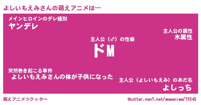| 女子向けラノベタイトル風あだ名 | 『(仮)よしいもえみのやんごとなき事情』 |