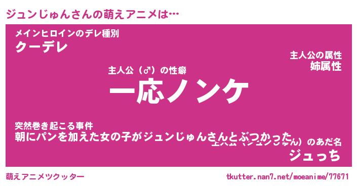 | 女子向けラノベタイトル風あだ名 | 『誰かこのジュンじゅんを説明してください! ~契約から始まるウェディング~』 |