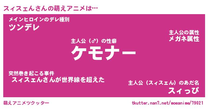 | 男性向けラノベタイトル風あだ名 | 『スィスェンアートオンライン』 |