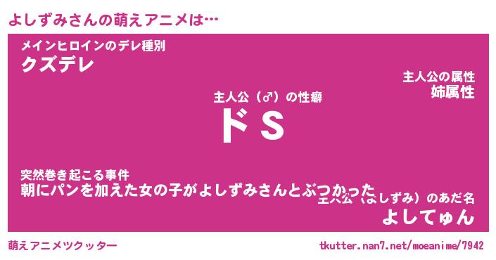 | 男性向けラノベタイトル風あだ名 | 『よしずみの憂鬱』 |