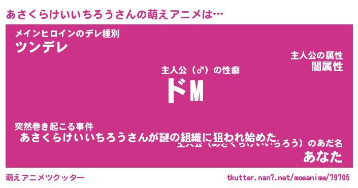 | 女子向けラノベタイトル風あだ名 | 『(仮)あさくらけいいちろうのやんごとなき事情』 |