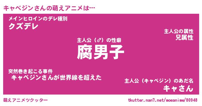 | 男性向けラノベタイトル風あだ名 | 『キャベジンアートオンライン』 |