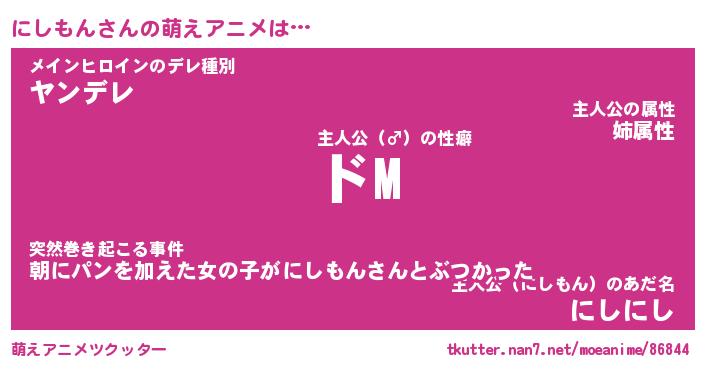 | 男性向けラノベタイトル風あだ名 | 『にしもんの憂鬱』 |