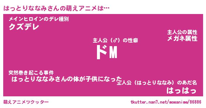 | 女子向けラノベタイトル風あだ名 | 『(仮)はっとりななみのやんごとなき事情』 |