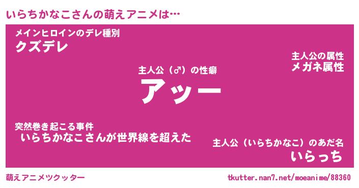 | 男性向けラノベタイトル風あだ名 | 『イラチカナコアートオンライン』 |