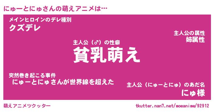 | 男性向けラノベタイトル風あだ名 | 『にゅーとにゅの憂鬱』 |