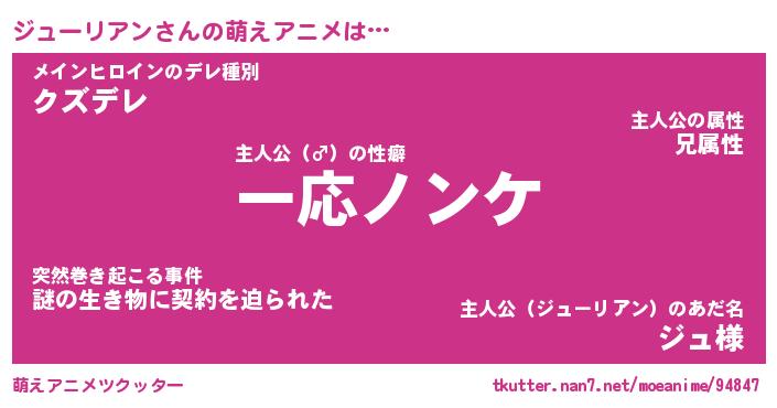 | 女子向けラノベタイトル風あだ名 | 『誰かこのジューリアンを説明してください! ~契約から始まるウェディング~』 |