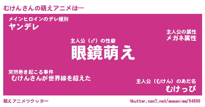 | 男性向けラノベタイトル風あだ名 | 『むけんの憂鬱』 |