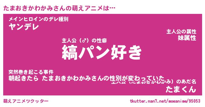 | 男性向けラノベタイトル風あだ名 | 『たまおきかわかみの憂鬱』 |