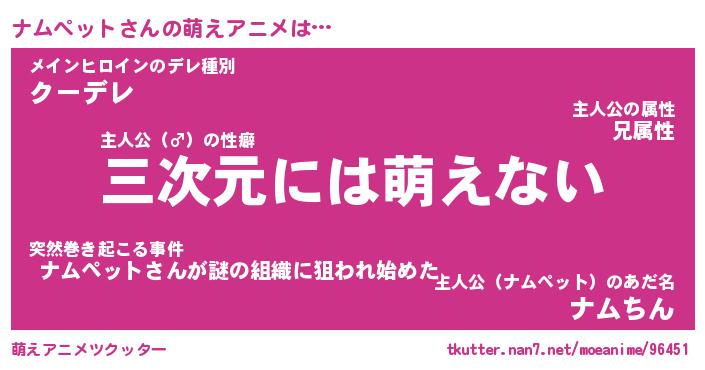 | 男性向けラノベタイトル風あだ名 | 『ナムペットアートオンライン』 |