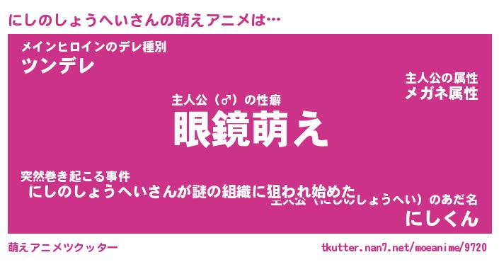 | 男性向けラノベタイトル風あだ名 | 『にしのしょうへいの憂鬱』 |