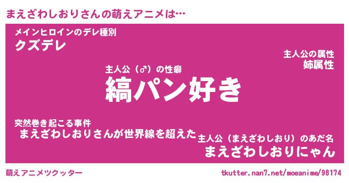 | 男性向けラノベタイトル風あだ名 | 『まえざわしおりの憂鬱』 |