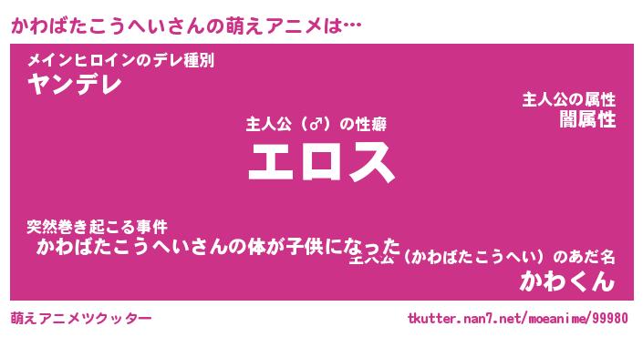 | 女子向けラノベタイトル風あだ名 | 『誰かこのかわばたこうへいを説明してください! ~契約から始まるウェディング~』 |