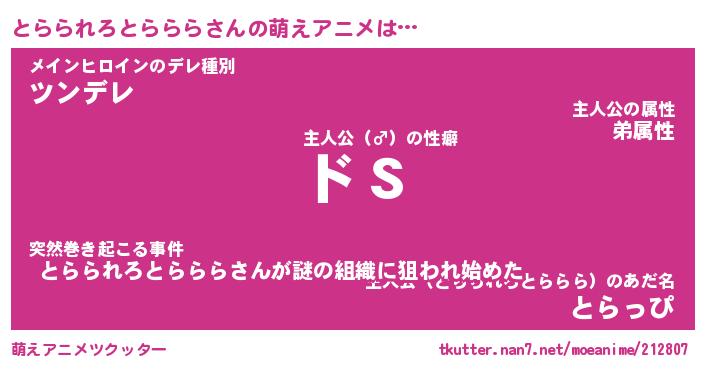 | 女子向けラノベタイトル風あだ名 | 『(仮)とらられろとらららのやんごとなき事情』 |