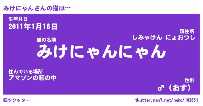 | 男性向けラノベタイトル風あだ名 | 『みけにゃんの憂鬱』 |