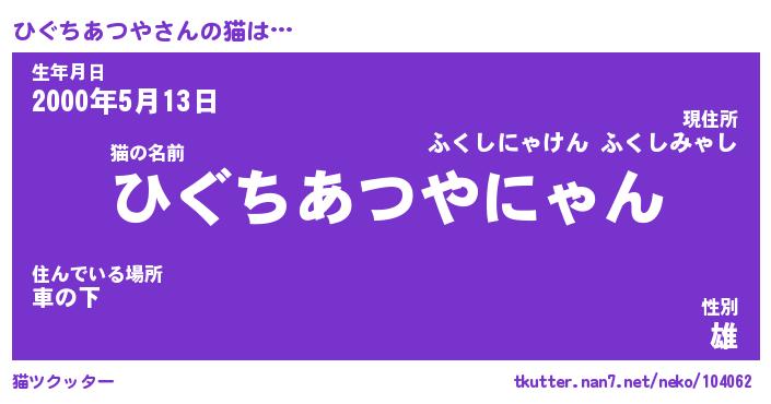 | 男性向けラノベタイトル風あだ名 | 『ひぐちあつやの憂鬱』 |