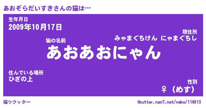 | ツイッター | あおぞらだいすきさんのツイッターID『namakemono_nyan』 |