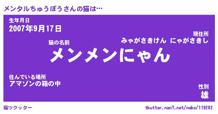 | ツイッター | メンタルちゅうぼうさんのツイッターID『namakemono_nyan』 |