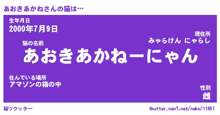 | ツイッター | あおきあかねさんのツイッターID『fukuyoka_kun』 |