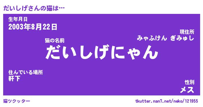 | 意味不明あだ名 | 『ペロリンだいしげ』『永久保存だいしげ』 |