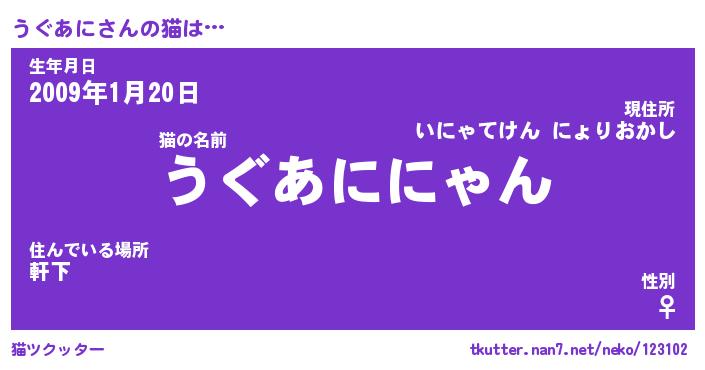 | 意味不明あだ名 | 『ペロリンうぐあに』『永久保存うぐあに』 |