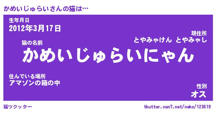 | 男性向けラノベタイトル風あだ名 | 『かめいじゅらいの憂鬱』 |