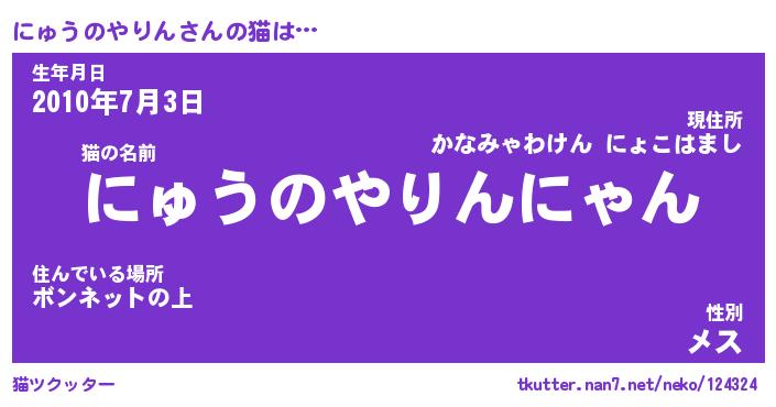 | 女子向けラノベタイトル風あだ名 | 『(仮)にゅうのやりんのやんごとなき事情』 |