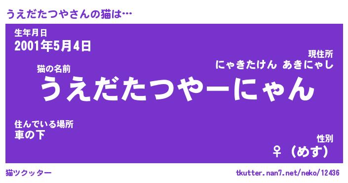 | 女子向けラノベタイトル風あだ名 | 『誰かこのうえだたつやを説明してください! ~契約から始まるウェディング~』 |