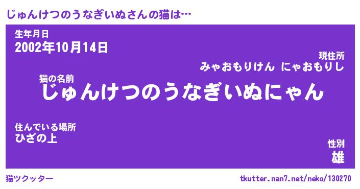 | 女子向けラノベタイトル風あだ名 | 『(仮)じゅんけつのうなぎいぬのやんごとなき事情』 |