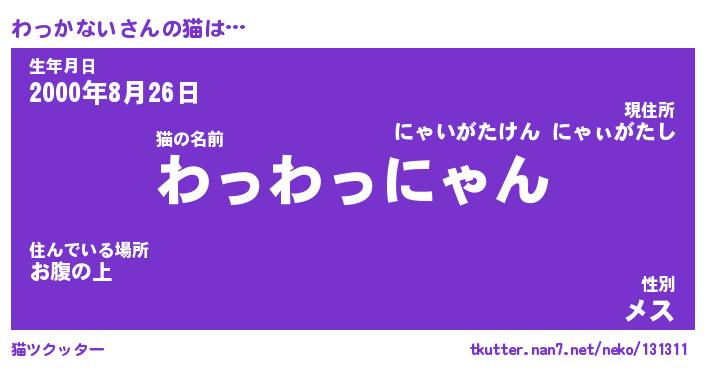 | ツイッター | わっかないさんのツイッターID『dendenmushi_nyan』 |