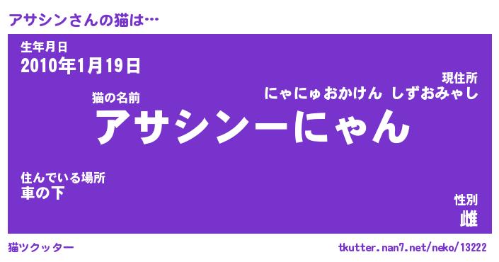 | 意味不明あだ名 | 『ペロリンアサシン』『永久保存アサシン』 |