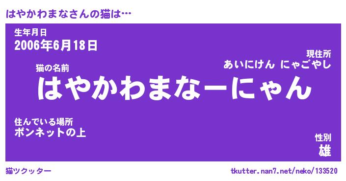 | 自動車の名前っぽいあだ名 | 『ハヤティマ』『ハクア』『デミハ』 |