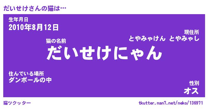 | 意味不明あだ名 | 『ペロリンだいせけ』『永久保存だいせけ』 |