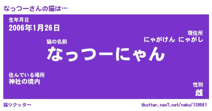 | 意味不明あだ名 | 『ペロリンなっつー』『永久保存なっつー』 |