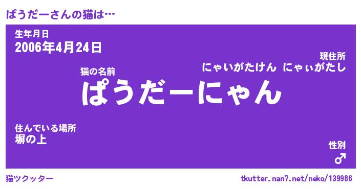 | 意味不明あだ名 | 『ペロリンぱうだー』『永久保存ぱうだー』 |