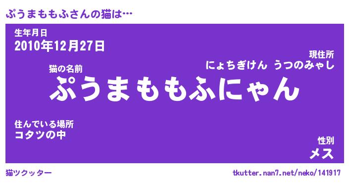 | 男性向けラノベタイトル風あだ名 | 『ぷうまももふの憂鬱』 |
