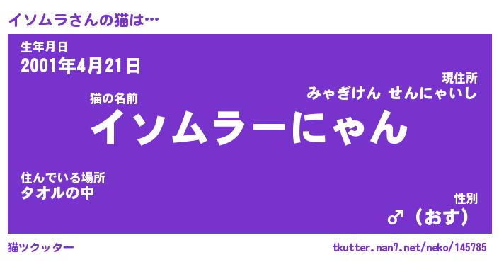 | 意味不明あだ名 | 『ペロリンイソムラ』『永久保存イソムラ』 |