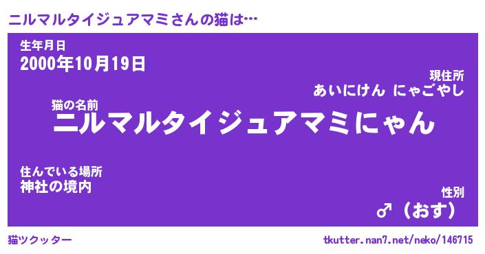 | 男性向けラノベタイトル風あだ名 | 『ニルマルタイジュアマミの憂鬱』 |