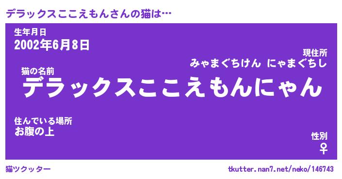 | 女子向けラノベタイトル風あだ名 | 『(仮)デラックスここえもんのやんごとなき事情』 |