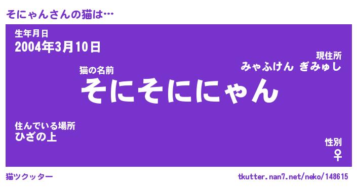 | 意味不明あだ名 | 『ペロリンそにゃん』『永久保存そにゃん』 |