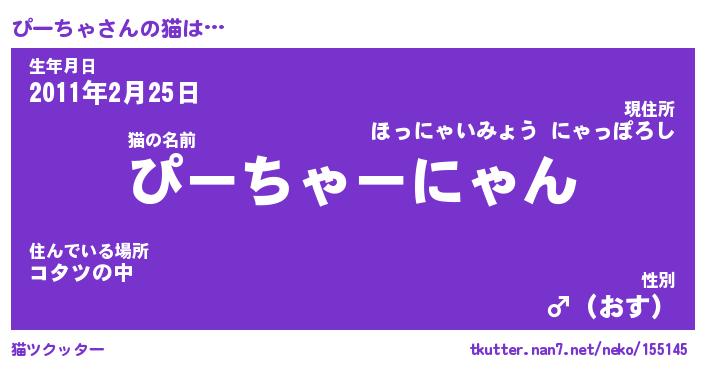 | 意味不明あだ名 | 『ペロリンぴーちゃ』『永久保存ぴーちゃ』 |