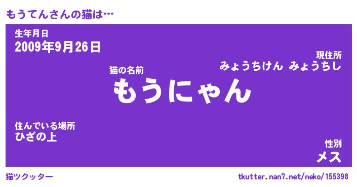 | 意味不明あだ名 | 『ペロリンもうてん』『永久保存もうてん』 |
