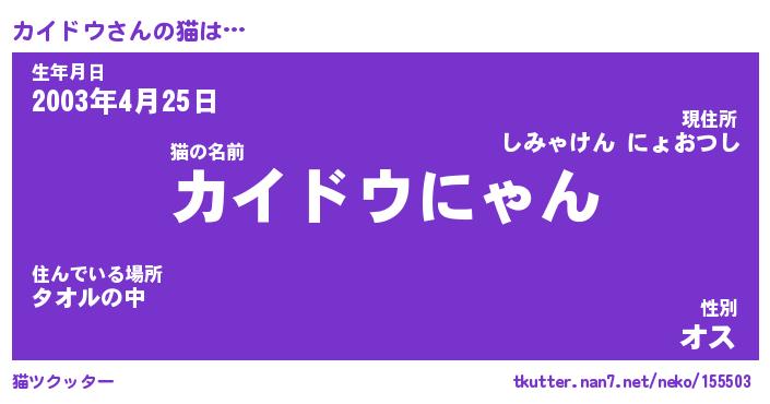 | 意味不明あだ名 | 『ペロリンカイドウ』『永久保存カイドウ』 |