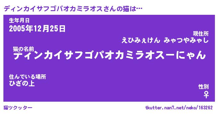 | 欧米人風あだ名 | 『マイケルディンカイサフゴパオカミラオス』 |
