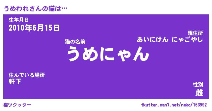 | ファンタジー風あだ名 | 『ウメフェル』『エターナルウメワレー』 |