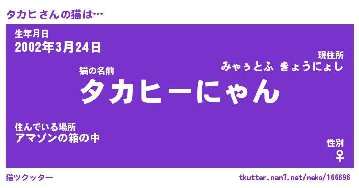 | ファンタジー風あだ名 | 『タカフェル』『エターナルタカヒー』 |