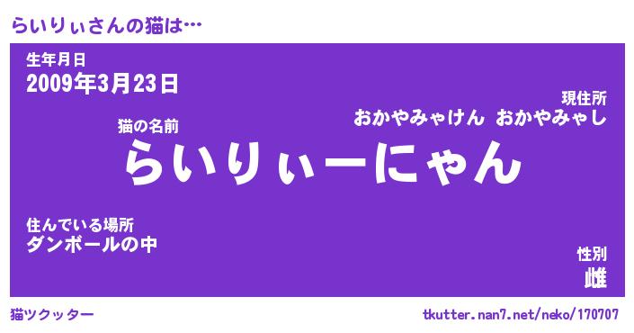 | 意味不明あだ名 | 『ペロリンらいりぃ』『永久保存らいりぃ』 |