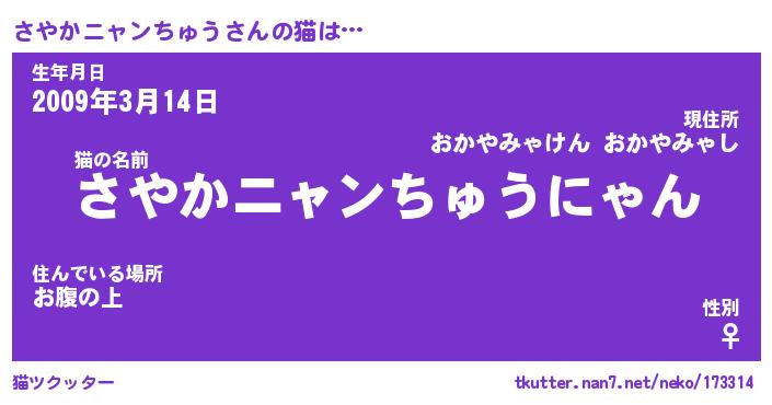 | 男性向けラノベタイトル風あだ名 | 『さやかニャンちゅうの憂鬱』 |