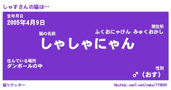 | ツイッター | しゃすさんのツイッターID『dendenmushi_nyan』 |